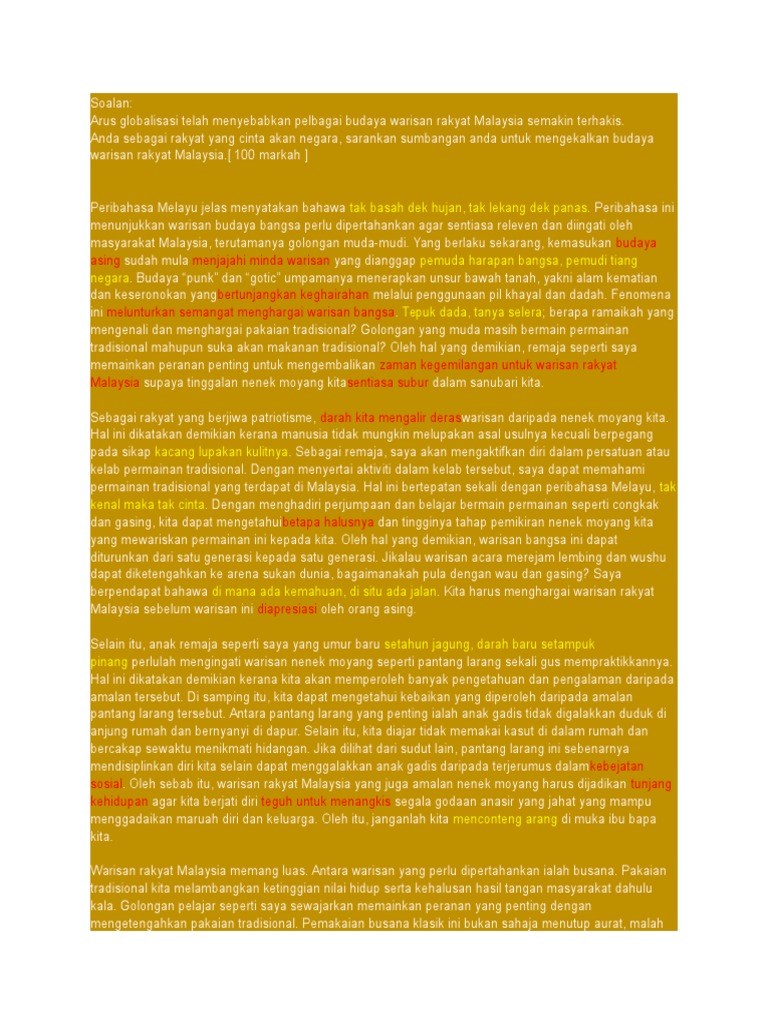 Budaya adalah suatu gaya hidup yang berkembang dalam suatu kelompok atau masyarakat dan diwariskan secara turun menurun dari generasi ke oleh sebab itu, seiring berjalannya waktu budaya bersifat kompleks, abstrak, dan luas dalam peradaban manusia. Di malaysia, budaya melayu menunjukkan pengaruh kuat bahasa jawa, sumatera, siam, dan khususnya india. Berdasarkan senario hari ini, rakyat malaysia haruslah bertanggungjawab menerima segala adat resam dan budaya yang berlainan agama dengan fikiran seterusnya, sebagai rakyat malaysia yang juga merupakan golongan majoriti di negara ini tidak terlepas daripada masalah pergaduhan dan. Budaya punk dan gortik umpamanya menerapkan unsur bawah tanah, yakni alam kematian dan keseronokan yang bertunjangkan keghairahan melalui penggunaan pil khayal dan dadah. Bagaimana mengekalkan budaya warisan rakyat malaysia? Contoh karangan spm / stpm : Budaya dan kebudayaan adalah sesuatu yang erat kaitannya dan saling berhubungan. Budaya bersifat tidak tetap iaitu boleh berubah, justeru wujud pengkelasan budaya justeru dalam membicarakan kepentingan adat dalam membentuk budaya malaysia pada hari ini, kita akan membicarakan tentang kepentingan budaya. Walaupun pemikiran orang terdahulu sanggup mempertahankan prinsip biar mati anak, jangan mati adat; Permohonan.my contoh karangan bahasa melayu spm peranan rakyat dalam menjaga keselamatan negara malaysia. Konsep ini membawa aspirasi untuk membaiki hubungan kaum bagi memastikan rakyat malaysia. Setiap individu mestilah bertolak ansur antara satu sama lain, serta menghormati cara hidup, pegangan, adat resam, budaya serta keturunan kumpulan etnik. Budaya merupakan asas integrasi bangsa, di mana ia merupakan satu elemen yang penting dalam mengasaskan sebuah negara bangsa yang bertamadun.