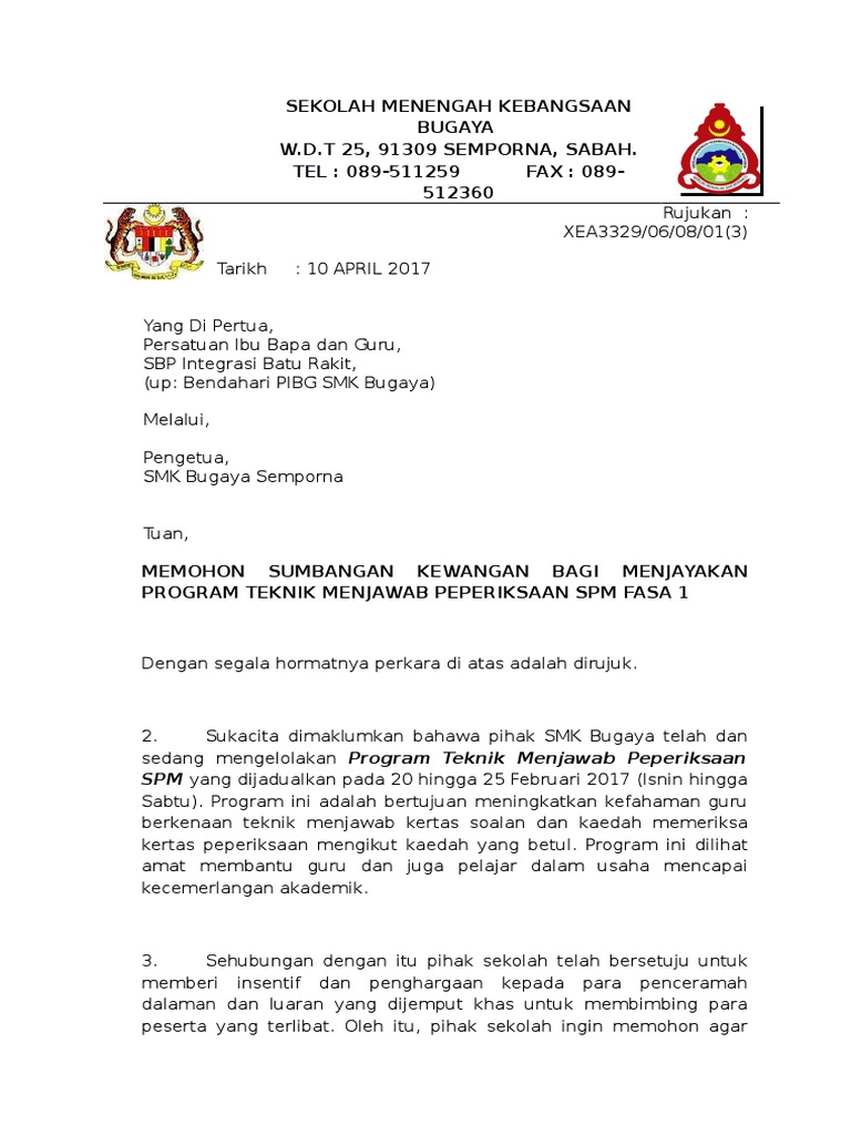 66361916 Contoh Surat Mohon Sumbangan from imgv2-1-f.scribdassets.com Memohon sumbangan kewangan untuk membina dataran berbumbung laman bestari smk datok lokman. Sumbangan yang diberikan, diharap dapat mempercepatkan proses memulakan projek pembinaan. Surat permohonan bantuan dana adalah surat yang menyatakan bahwa yang membaut bermaksud meminta bantuan dana dari sumber dana. Saya bagi pihak kelab guru dan kakitangan smk telok gadong ingin memohon sumbangan berbentuk kewangan/hadiah/barangan untuk jamuan akhir. Memohon sumbangan kewangan bagi pembiayaan kos rawatan via infohewikpt.blogspot.com. Pembahagian tugas di lorong ppda melibatkan semua guru skkst. Y.b tan sri/y.b dato/y.b datin/tuan/ puan, per : Contoh surat mohon sumbangan kepada yb.