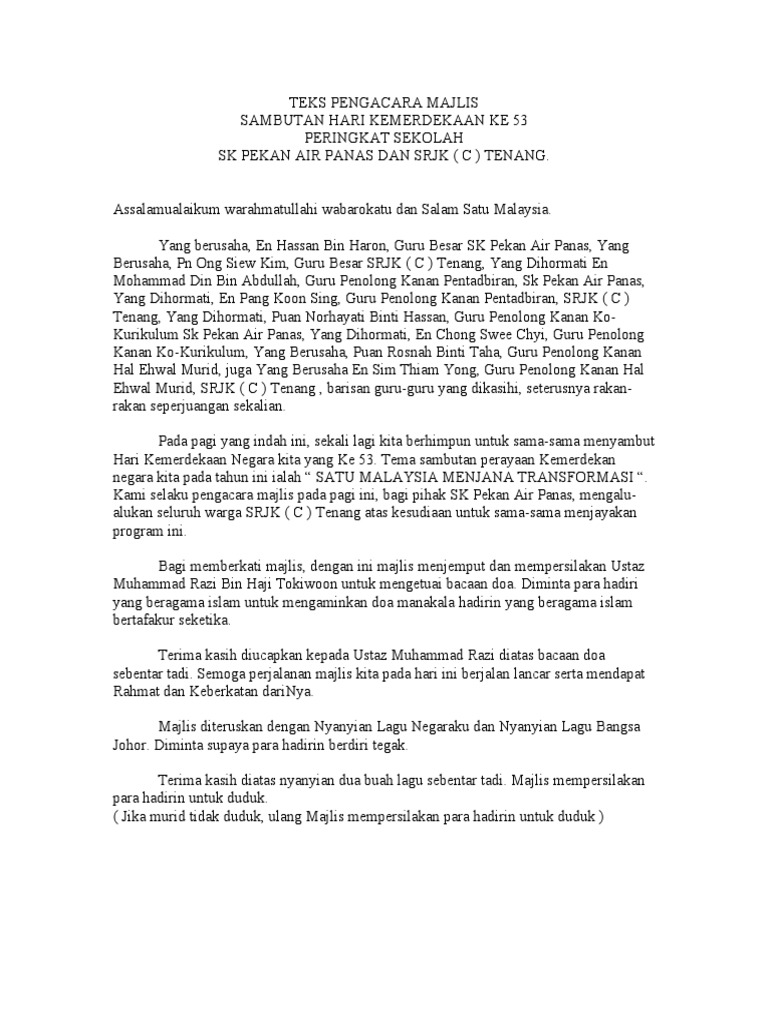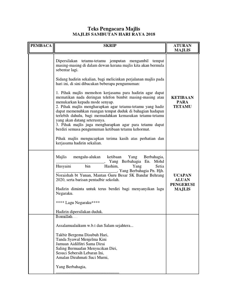 Skrip Pengacara Majlis from imgv2-2-f.scribdassets.com Majlis ini dimulakan dengan bacaan yassin dan solat hajat di surau hj mansur. Mc hari kanak kanak 2014 docx teks pengacara majlis majlis sambutan hari kanak kanak sk p bandar tinggi johor bahru 2014 sirih berlipat kertas kerja sambutan hari raya 2018. Assalamualaikum w.b.t, salam sejahtera, salam 1 malaysia. Kreatif murni @koleksi teks pelancaran. Pihak sekolah mengucapkan jutaan terima kasih kepada semua pihak yang terlibat dalam menjayakan majlis sambutan hari raya peringkat sekolah pada tahun 2017. Acara majlis sambutan maulidur rasul berhenti seketika. Majlis sambutan hari raya 2020 peringkat smk chung hwa wei sin pada 4 jun 2020 jam 10.00 pagi secara atas talian melalui tele sidang google meet dan. Cikgu nurul @koleksi pantun teks pengacara.