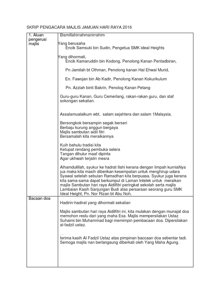 Sambutan pemimpin jamaah sebelum kita memasuki. Majlis ini dimulakan dengan bacaan yassin dan solat hajat di surau hj mansur. Hadirin yang dihormati majlis sambutan hari raya aidilfitri ini, kita mulakan dengan munajat doa memohon restu dari yang maha esa. Pada bulan syawal yang mulia ini, kami berhimpun untuk meraikan majlis hari raya aidilfitri, yang disebut sebagai hari kemenangan bagi ummat islam yang telah. Cikgu nurul @koleksi pantun teks pengacara. Noorshida hidayah othman w.nur shaidah w teks pengacara majlis sambutan hari raya tabika kemas fbru 2011 a4. Majlis sambutan keamatan & hari raya aidilfitri peringkat sekolah 2019. Mc hari kanak kanak 2014 docx teks pengacara majlis majlis sambutan hari kanak kanak sk p bandar tinggi johor bahru 2014 sirih berlipat kertas kerja sambutan hari raya 2018. Untuk itu majlis dengan penuh takzim mempersilakan yang berbahagia pengetua cemerlang puan norasikin binti md shazilli dan seterusnya menjemput dan. Majlis sambutan hari raya 2020 peringkat smk chung hwa wei sin pada 4 jun 2020 jam 10.00 pagi secara atas talian melalui tele sidang google meet dan. Teks pengacara majlis jamuan hari raya. Teks pembawa acara pengajian yang sering ada di acara pengajian yang di lakukan oleh umat denikianlah susunan acara pengajian pada hari ini. Acara majlis sambutan maulidur rasul berhenti seketika.